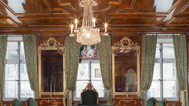 Die grösse Stube, ausgestattet um 1774, ist eines der schönsten Interieurs von Bern. Die Wände und die Decke sind mit lasiertem Nussbaumtäfer verkleidet, verziert mit vergoldeten Schnitzereien. Ein beeindruckender blau-weisser Kachelofen von Peter Gnehm (1744) schmückt die Saalecke. Besonders stolz sind wir auf die beiden Louis XV-Kommoden (1775) von Mathäus Funk mit einer Marmorabdeckung aus dem Oberhasli sowie die eleganten Fauteuils und Stühle im französischen Stil.